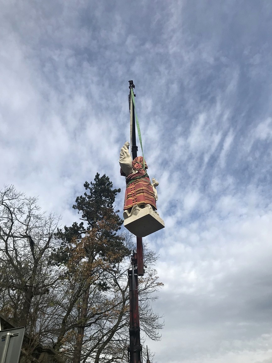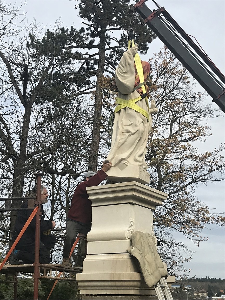 Originál sochy byl 8. prosince 2014 snesený z podstavce a převezený do atelieru sochaře a restaurátora Jaroslava Fuky v Sudoměři. Bohužel během převážení se socha rozpadla na několik kusů, při dalším postupu prací se ukázalo, že je v daleko horším stavu, než se předpokládalo. Laboratorní testy ukázaly, že sochu po dokončení restaurování už nebude možné umístit ve venkovním prostředí, proto bylo rozhodnuto, že originál sochy bude umístěný ve vestibulu Kopáčkova domu a na podstavec u kostelíka bude vytvořena kopie.