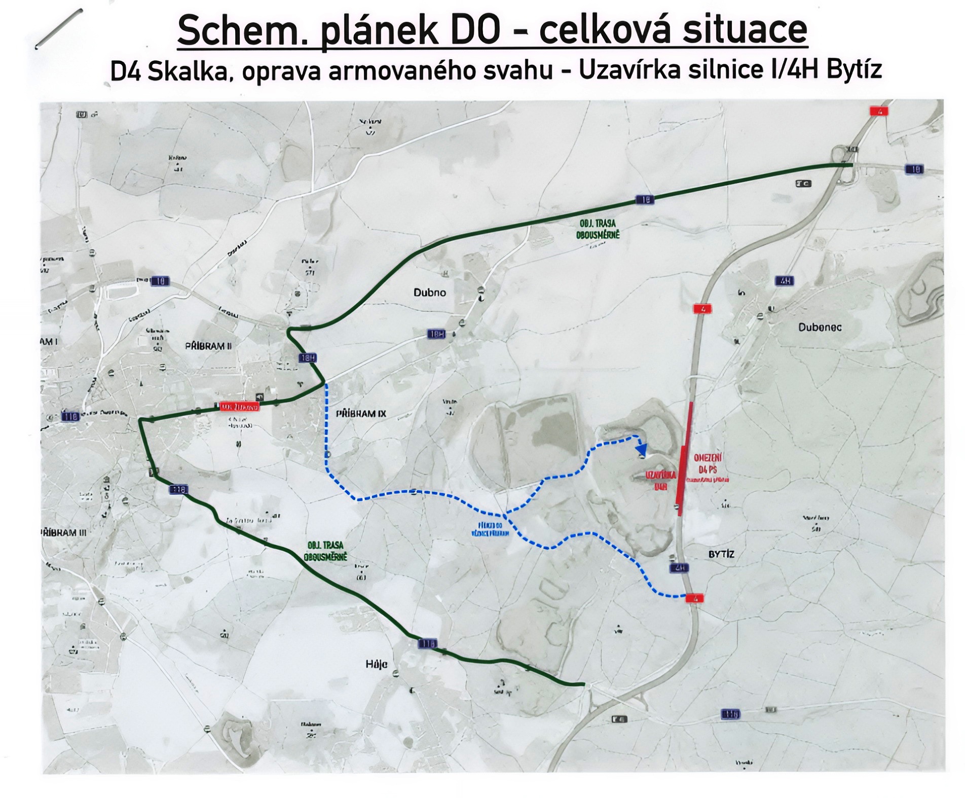 Uzavírka se týká zhruba třísetmetrového úseku přímo u nájezdu do věznice. Po dobu prací bude nutné využívat objízdnou trasu přes obslužnou komunikaci od skládky a recyklačního centra v Bytízi a Středního odborného učiliště Dubno.